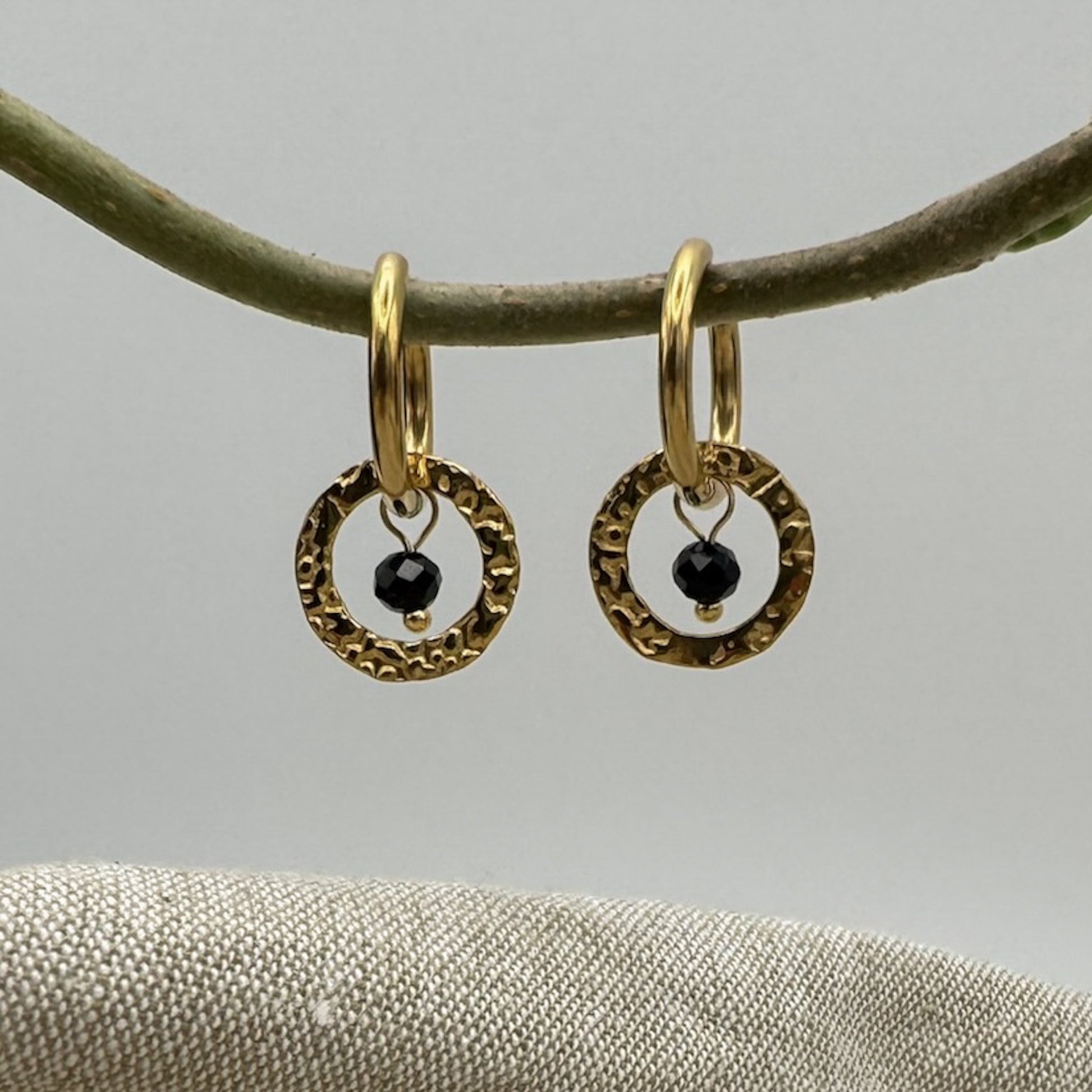 Das Zusammenspiel aus dem gehämmerten Ring und dem farbigen Kristall-Anhänger, macht diesen Ohrring ganz besonders.