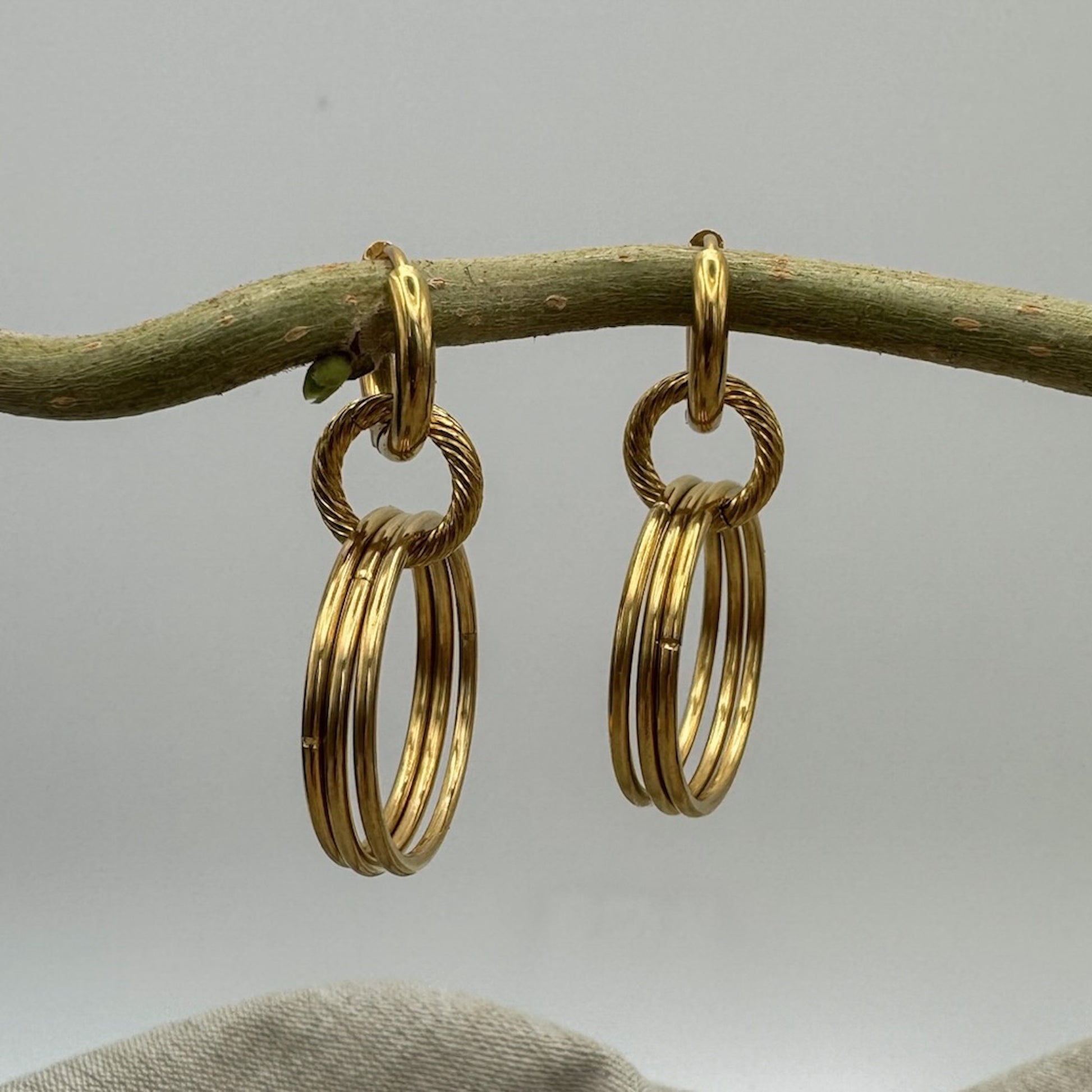 Das Zusammenspiel aus dem Hoop, dem gedrehten Ring und den drei größeren Ringen, macht diese Ohrringe zu einem ganz besonderem Schmuckstück.
