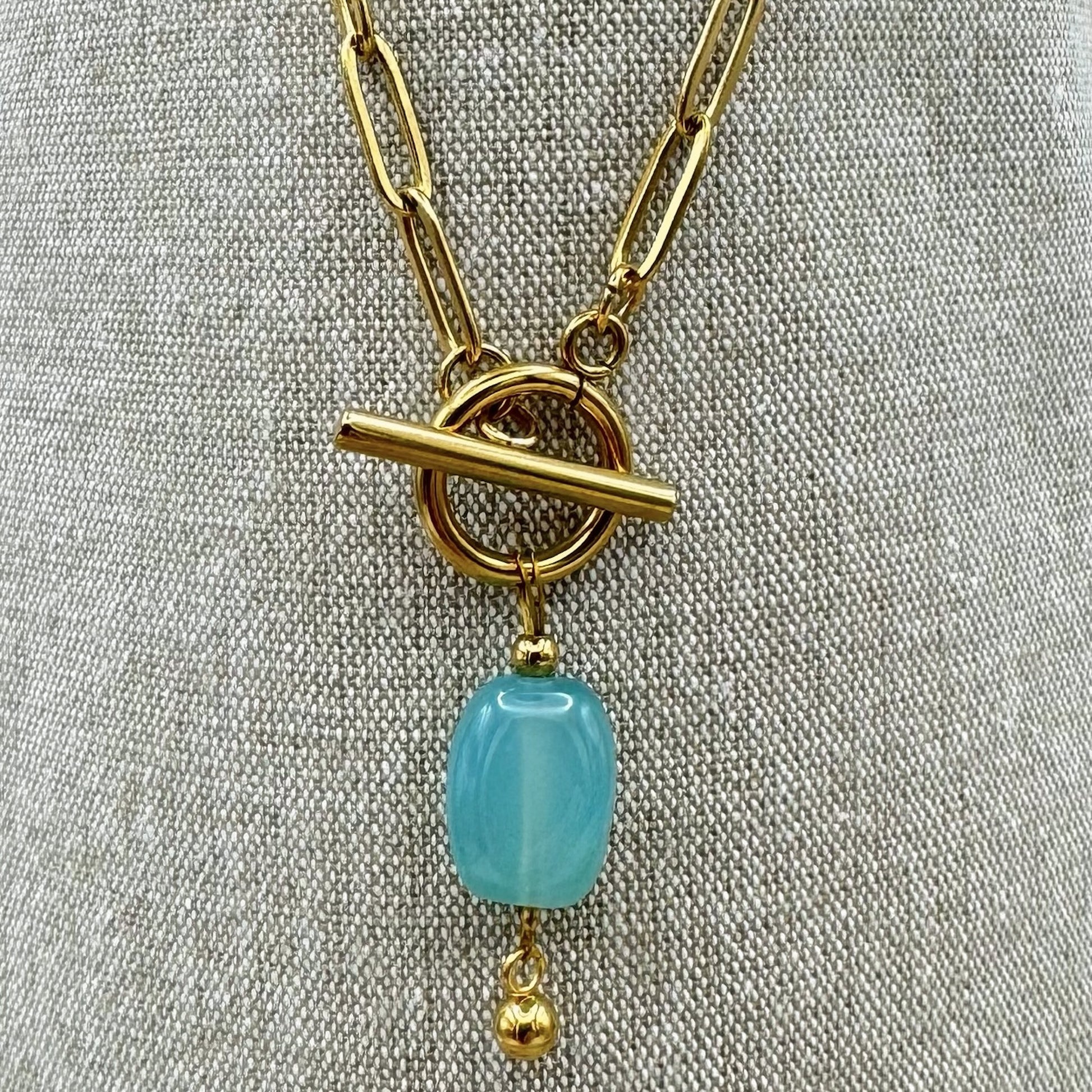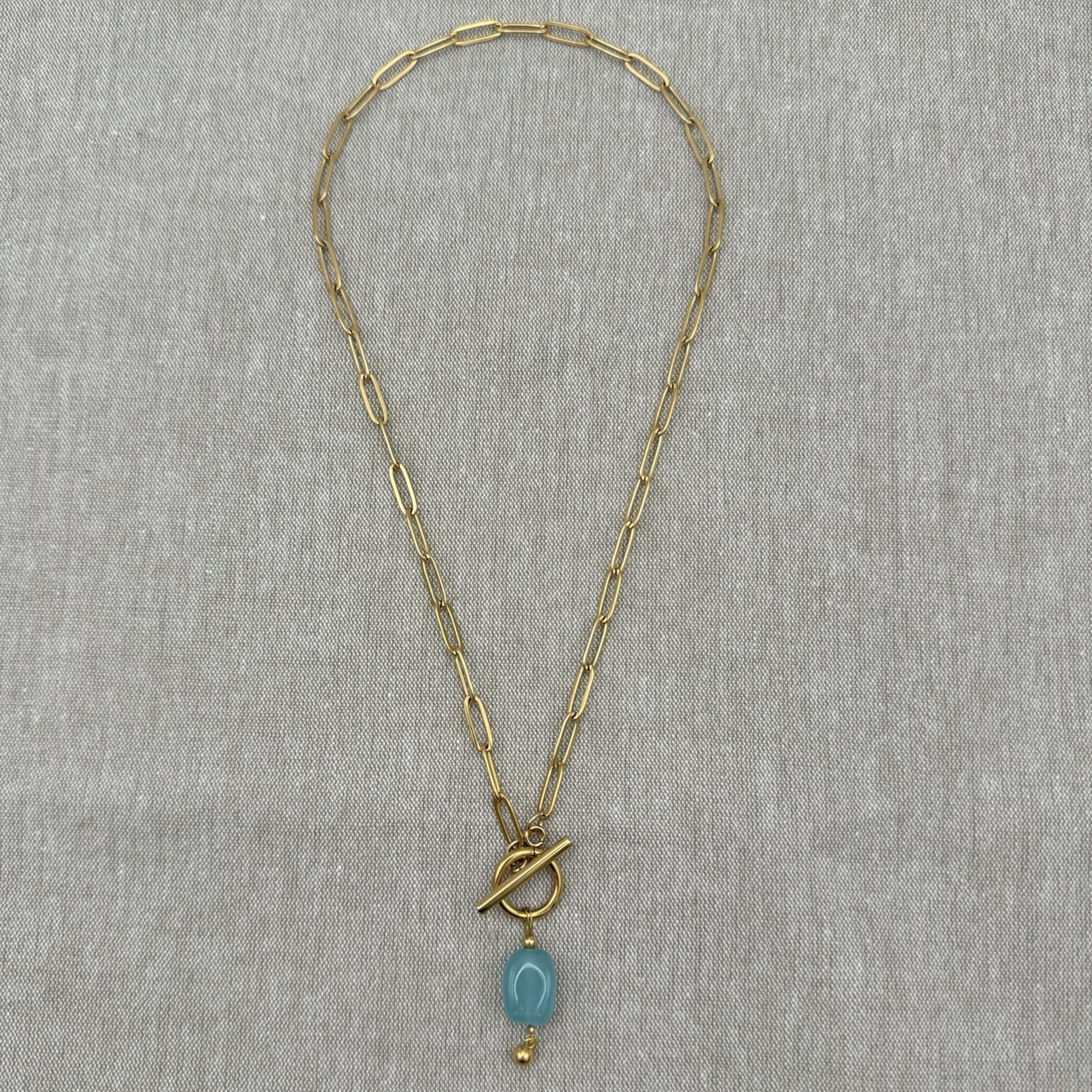 Die Kette besticht durch ihren einzigartigen Look, welcher aufgrund der Kombination des Knebelverschluss und des Chalcedon-Steines zustande kommt. Der Anhänger glänzt durch seine besondere türkise Farbe und ist ein absoluter Hingucker.